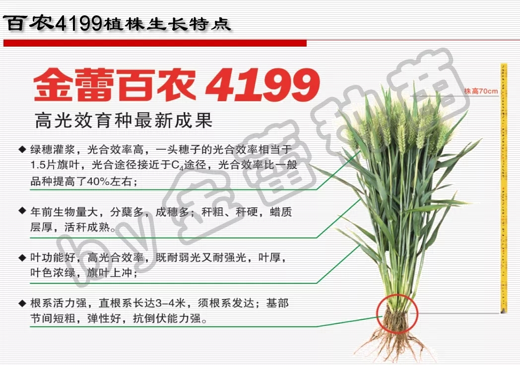 隨后,茹振鋼教授帶領(lǐng)團隊用高光效親本通過與百農(nóng)AK58雜交,先后研究解決麥穗、麥稈、根系等難題,克服了掉穗、營養(yǎng)供給不足等問題,成功培育出高光效小麥品種金蕾百農(nóng)4199。