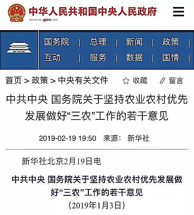 19日晚間,中共中央、國務(wù)院發(fā)布的《關(guān)于堅持農(nóng)業(yè)農(nóng)村優(yōu)先發(fā)展 做好“三農(nóng)”工作的若干意見》(簡稱《意見》)指出,今明兩年是全面建成小康社會的決勝期,“三農(nóng)”領(lǐng)域有不少必須完成的硬任務(wù),全文11000多字的文件對農(nóng)村改革發(fā)展提出的新要求,全面推進鄉(xiāng)村振興,確保順利完成到2020年承諾的農(nóng)村改革發(fā)展目標任務(wù)。